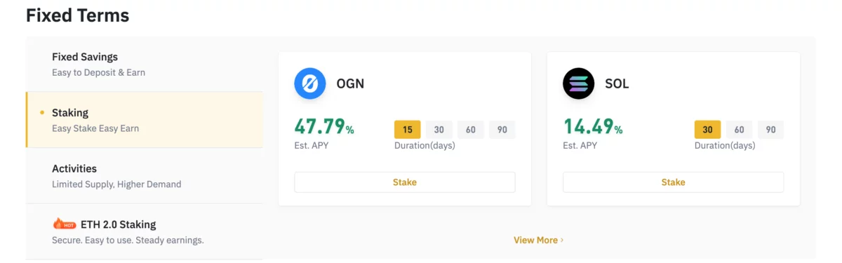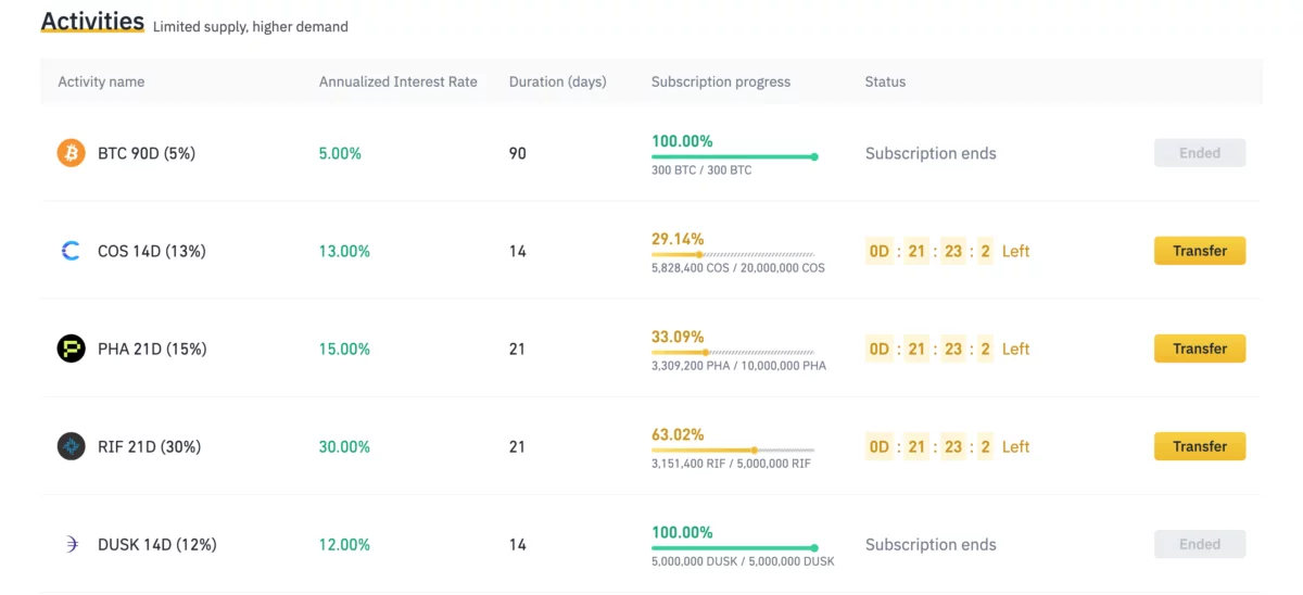 อีกอย่าง Binance ยังมีรับแบบการลงทุนการฝาก Token + จำกัดเวลา ให้บริการด้วยที่หน้าเมนู Activities อันนี้ก็คล้าย ปล่อยกู้เงิน เช่น 14วัน, 21วัน, 90วัน ซึ่งผลตอบแทนเฉลี่ย 3-20%
