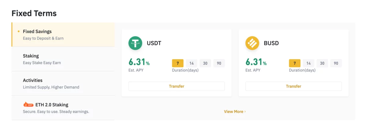 บริการฝากออมทรัพย์โดยใช้สินทรัพย์ดิจิทัลมาฝากกับ Binance ครับ โดยจะได้รับผลตอบแทนขั้นต่ำการฝากเฉลี่ย 0.13-10% (แนะนำฝากเป็นเหรียญ Stablecoin เช่น USDT เป็นต้น) และฝากประจำ (Fixed Rate) ผลตอบแทนเพิ่มขึ้นอีกเล็กน้อยครับ