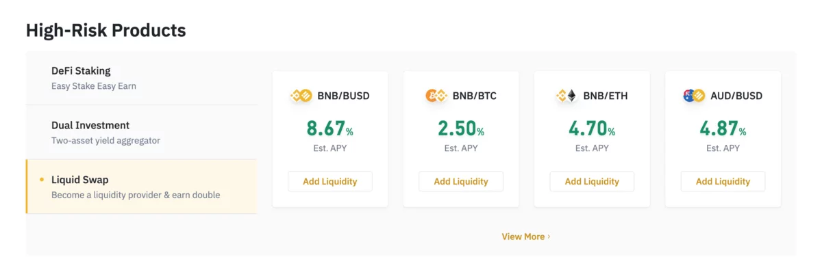 เป็นบริการฝากเหรียญพร้อมกันและจ่ายผลตอบแทนจากส่วนแบ่งค่าธรรมเนียมของการทำธุรกรรมระหว่างคู่ Token นั้น ๆ เช่น คู่ BNB/BUSD, AUD/BUSD ฯลฯ